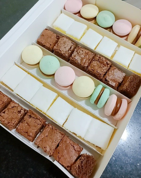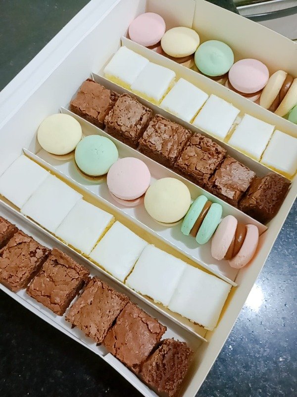 Caja con 36 unidades surtidas, pueden ser brownies, lemonies, alfajores, cookies con chips de chocolate, galletitas rellenas
